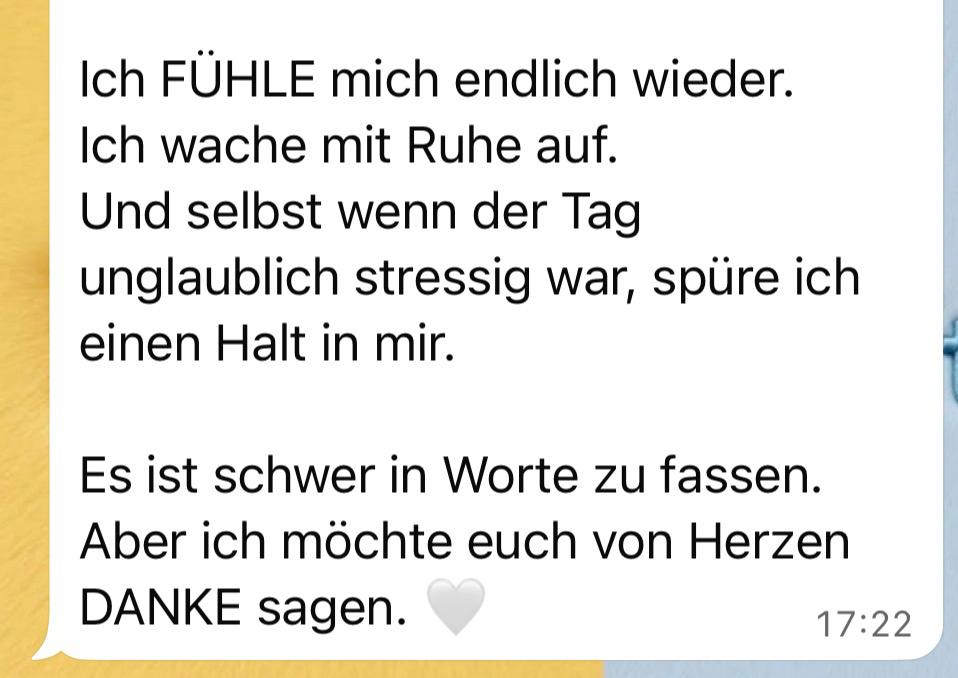 Du erlebst dein Leben auf eine neue Art – ruhiger, klarer, verbundener – auf eine Weise, die sich gut anfühlt, die dich stärkt und dir zeigt, dass du bei dir selbst bleiben kannst, egal was im Außen passiert.