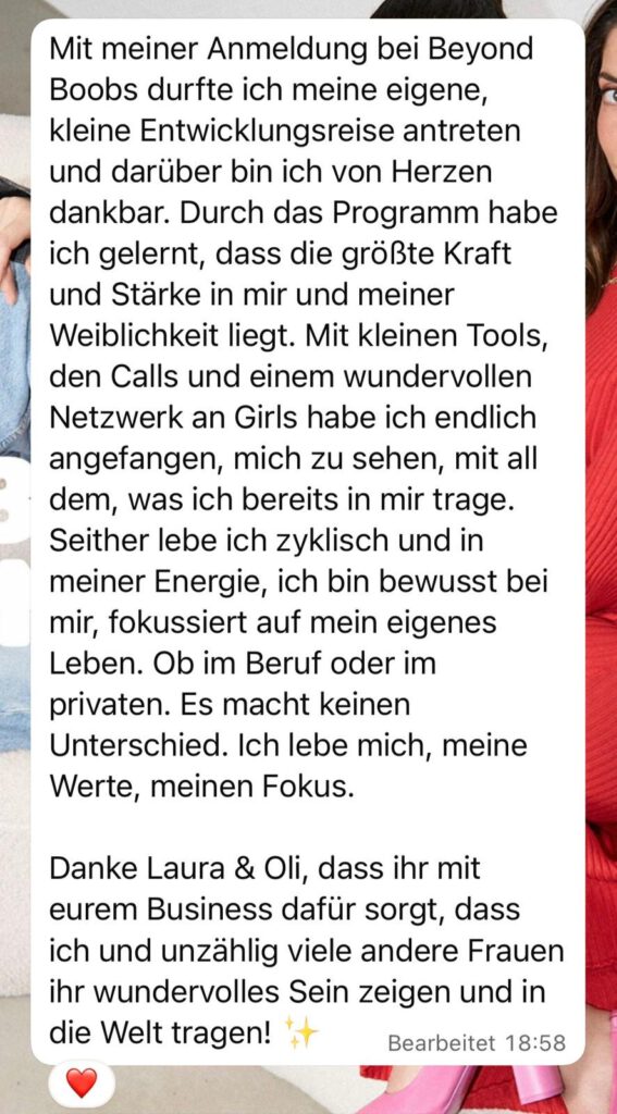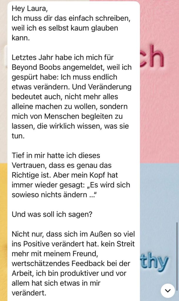 Trag dich jetzt unverbindlich ein und erfahre als Erste, wann die Anmeldung für Beyond Boobs öffnet. Dein 10-Wochen-Online-Programm, wo Klarheit, Balance & echter Erfolg beginnen.